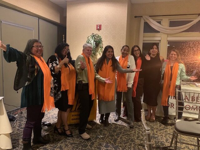 Karen Keough-Huff, chair of the Advocacy Committee, explained that all clubs around the world are united during this campaign to educate about and advocate for preventing violence, protecting victims, and prosecuting perpetrators. She then introduced the table of Writing Sisters, who are here tonight to share their personal writings and inspire action in support of women survivors. Karen aka ‘Q’ started with her poem, followed by presenters Darlene Elias, Jupong Lin, Jacqueline Velez, Mydalis Vera, Marissa Quintero, and Kaia Jackson.  One after another, the readings were heartfelt, inspiring, and professionally delivered. Zonta is proud to stand with these amazing women. The orange scarves were handmade by the Zonta Club of Concord, NH for the 2025 District Conference.