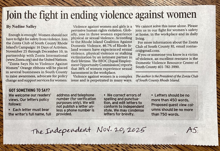 In support of the worldwide efforts of Zonta International and the United Nations, our club members have been wearing orange ‘Zonta Says No to Violence against Women’ ribbons to prompt discussions with friends and neighbors. We also placed baskets of orange ribbons at select local businesses along with an explanatory poster. And finally, we submitted an editorial piece to our local newspapers, The Independent and The Westerly Sun. According to the RI Coalition Against Domestic Violence, 46.7% of Rhode Island women have experienced contact sexual violence, physical violence and/or staking victimization by an intimate partner during their lifetime. We joined Zonta International in raising awareness of this global and local problem.